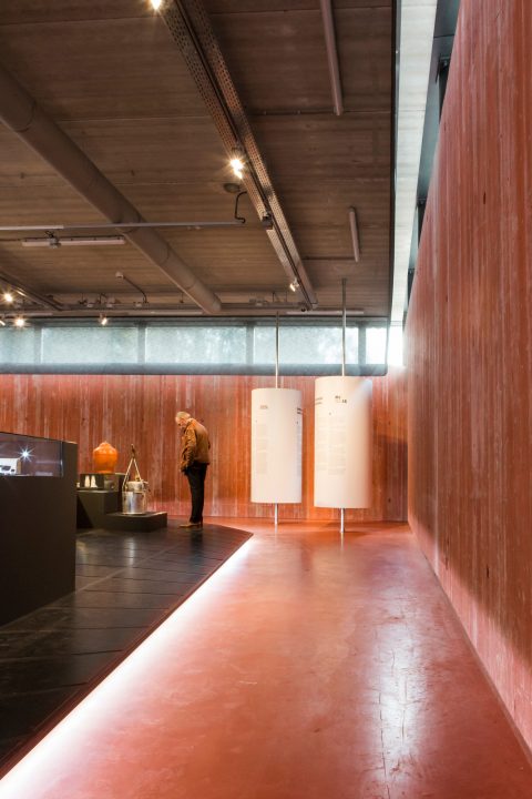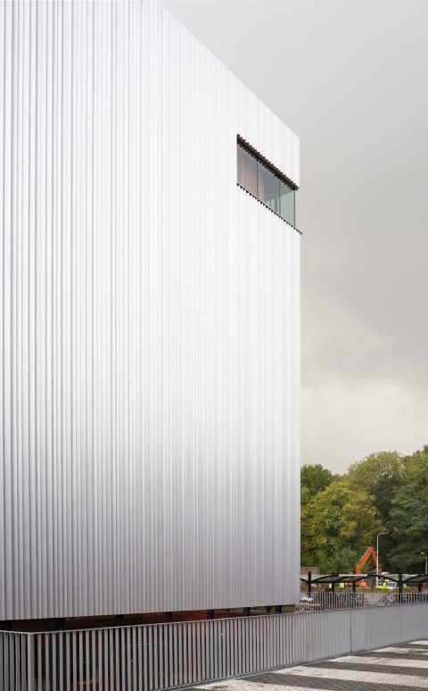 Cube is draped in a reflective curtain of coated steel that emphasizes the vertical character of the museum. The curtain effect is obtained by the random placement of vertical profiles of three varying folds that each reflect the light differently. The facade is cut open by two identical windows: one vertical that reveals the stacked exhibition floors, and one horizontal that provides the multifunctional space on the top floor with a panoramic view over the Limburg landscape.