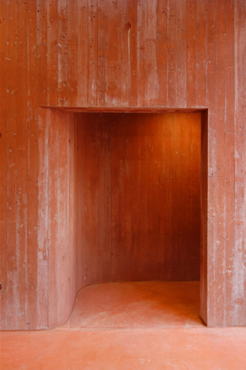 The museum is housed in a perfect cube measuring 21x21x21 meters. A glass plinth creates the illusion of a volume floating above the red underground landscape. Together with the patio, this plinth allows for natural light and views into the space underneath where the design labs are situated. True to their programmatic role as interface of the museum with the outside world of regional education centers, business and manufacturers, the design labs form the showcase of Cube towards the public space of the city.