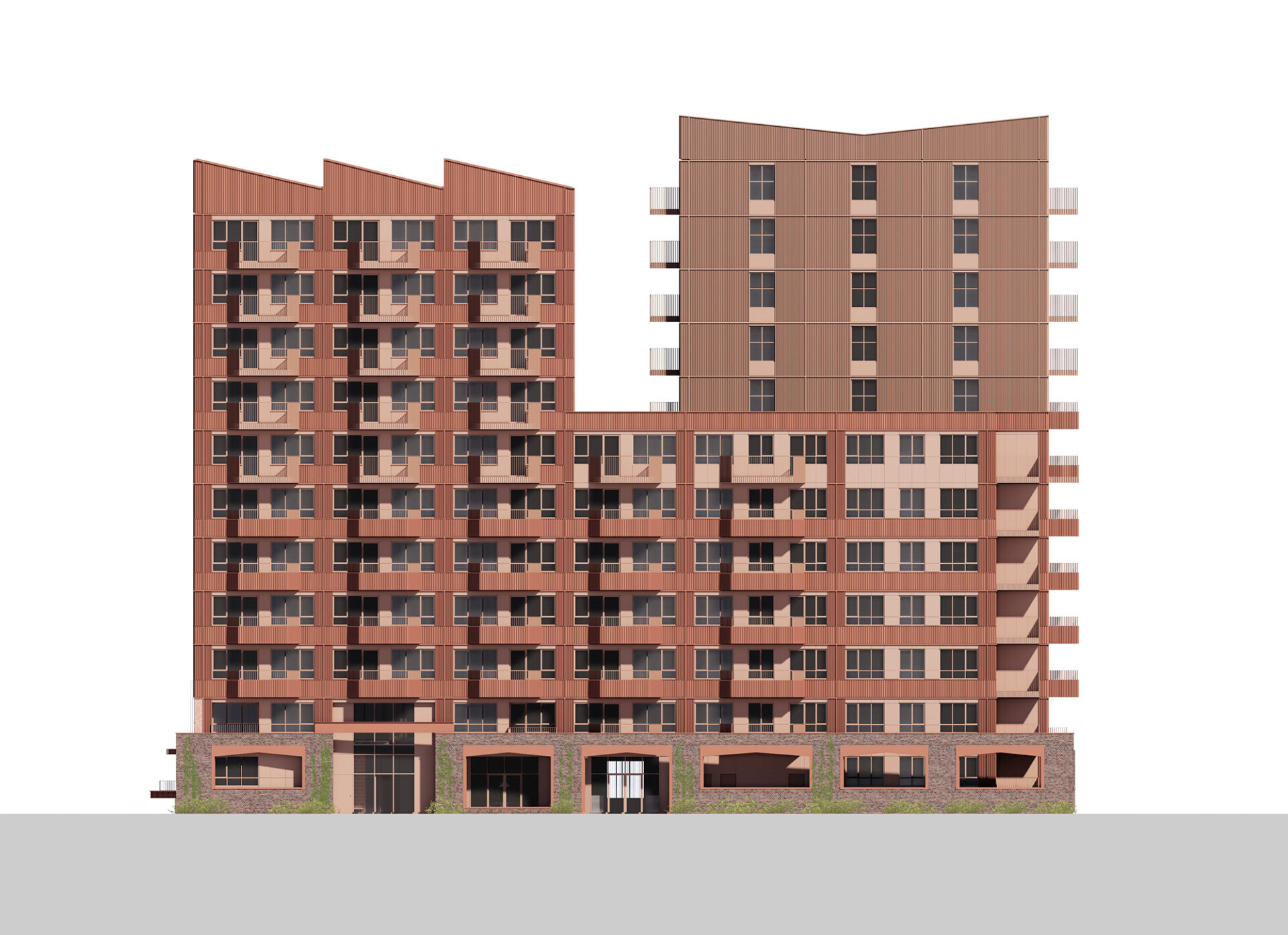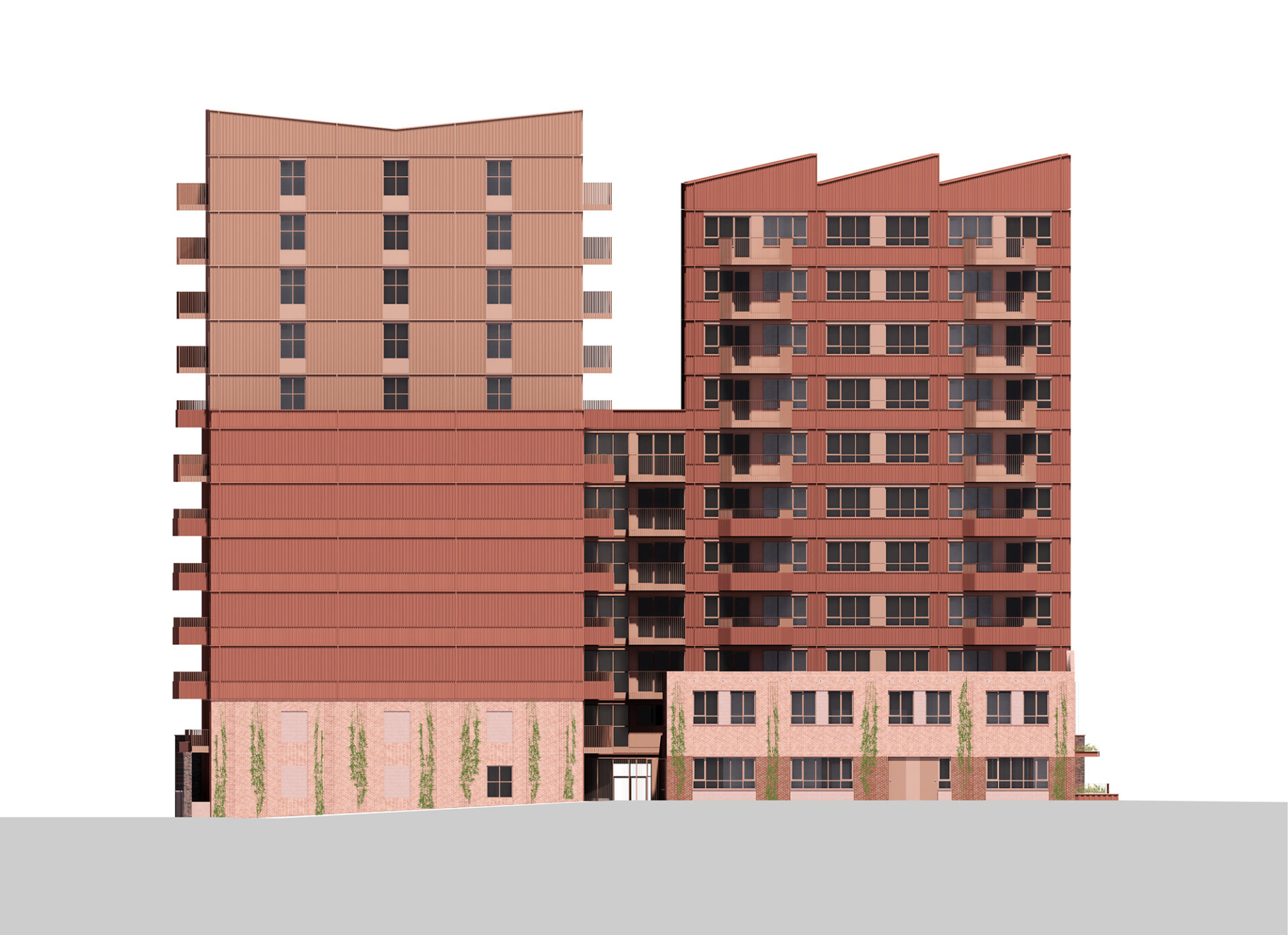 Our project adopts the rational and transparent facades of the former printing house that was situated here. Its industrial DNA is strengthened by the use of corrugated metal in brown-red, the most used color for shipping containers in the world.