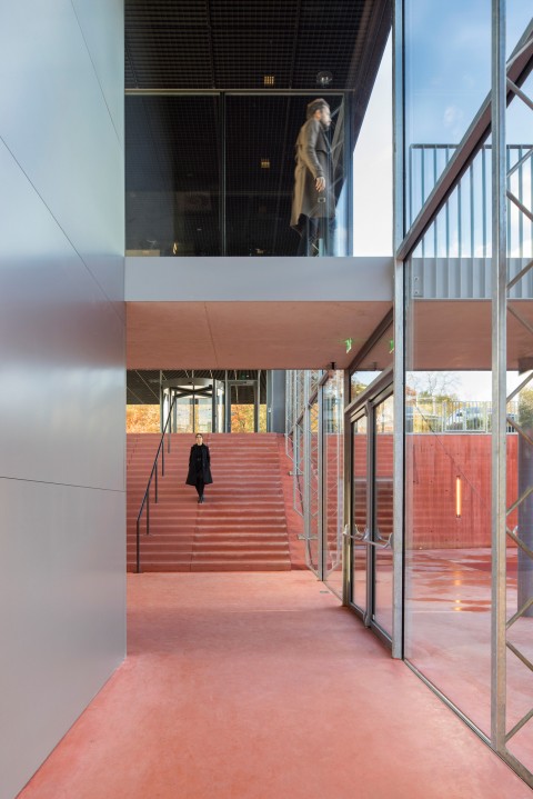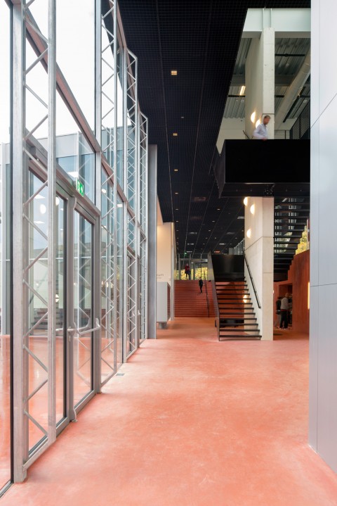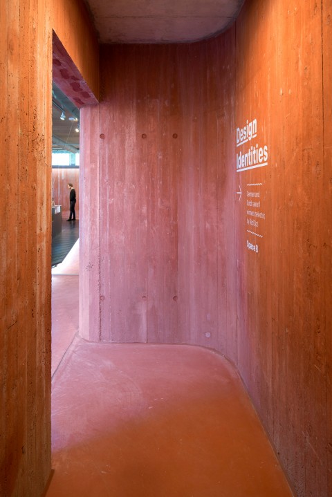 All stairs, walls and floors of the underground landscape are made of a uniform earth tone concrete to emphasize the connective character of the space and to create the suggestion of an excavation. The walls were poured in a formwork of rough wooden planks adding a tactile quality that contrasts with the abstract volumes above ground. The excavation out of red concrete, combined with the experience of descending below ground, refer to the mining past of Kerkrade.