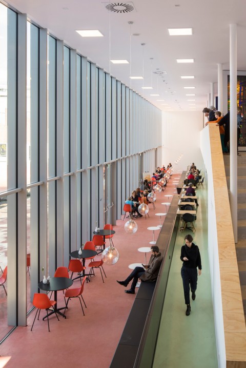 A transversal walkway, punching through the entrance hall, connects the sunken museum square to the district’s bus terminal in the forecourt. This walkway provides train and bus passengers direct access to the museum’s restaurant which can double as waiting room, transforming the museum square into a true extension of the public realm of Kerkrade.