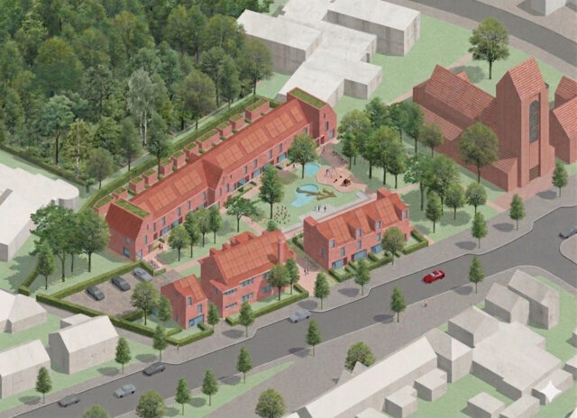 Set along the Vlokhovenseweg, on the site of a former school, the plan explicitly engages with the existing ensemble of church, school, presbytery and surrounding 1930s housing. Rather than introducing a contrasting urban model, the design builds on the spatial logic of the former “kerkdorp”: a recognisable cluster of buildings structured along a historic route. The restoration and reuse of the former school building, combined with new dwellings that align with the existing street and sit in a second line around the courtyard, reinforce this layered composition.